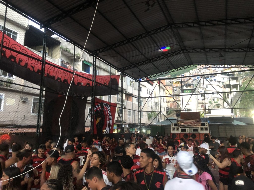 Assisti ao jogo com a Roça Fla, um grupo de torcedores do Flamengo na Rocinha. Já tinha assistido ao jogo de ida da final da Copa do Brasil, e para a final da Copa da Libertadores, o jogo era retransmitido numa quadra de futebol. E claro, a quadra estava cheia de rubro-negros. Eu estava com a camisa da Fla Paris e outra da Roça Fla. E já falei da hospitalidade dos brasileiros, mas vou falar mais uma vez aqui, porque fui muito bem acolhido de novo. O presidente da Roça Fla, Fernando, me acolheu com sorriso, abraços e muita fé na vitória do Flamengo. E retribuí um pouco o carinho, chamando franceses para assistir ao jogo na Rocinha. Dois foram, e acho que eles gostaram muito do ambiente do local. Talvez mais dois rubro-negros no mundo. Porque a paixão flamenguista é contagiante.